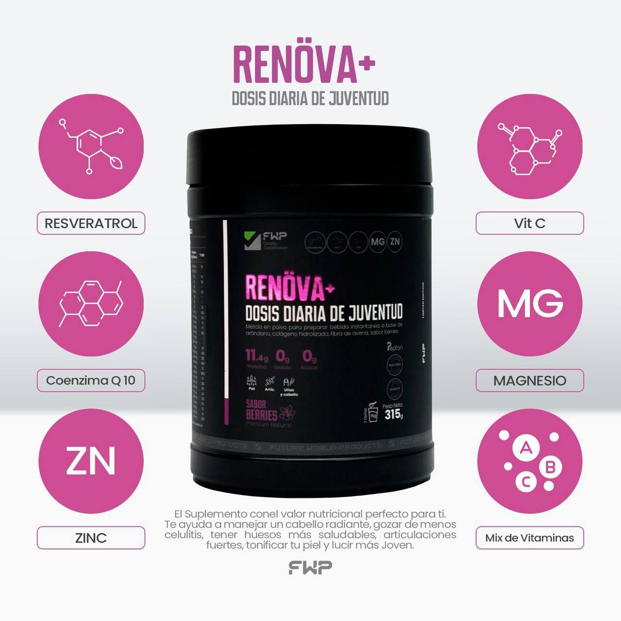 Colágeno RENOVA, con RESVERATROL, Q10, Vitamina C para dolores de rodillas y caída de cabello